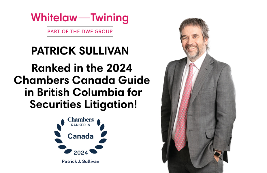 WT is proud to announce partner, Patrick Sullivan has been ranked in the 2024 Chambers Canada Guide in British Columbia for Securities Litigation.