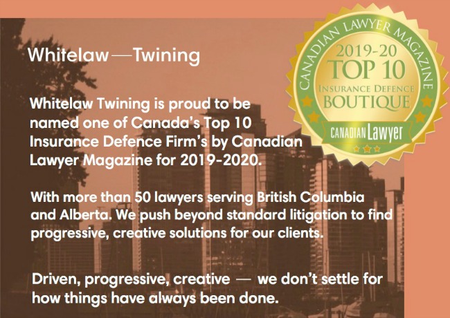 Home — Updates Whitelaw Twining is proud to be named one of Canada’s Top 10 Insurance Defence Firm’s by Canadian Lawyer Magazine for 2019-2020 1 14 2019 Print Share: To view Whitelaw Twining’s feature in Canadian Lawyer Magazine, click here.